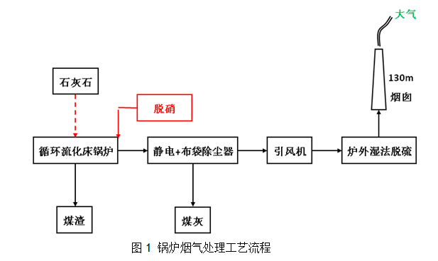 公司配套的熱電廠建設有2臺190t/h環保型低氮燃燒循環流化床鍋爐。 鍋爐煙氣通過鍋爐爐內脫硫(備用)、脫硝、靜電+布袋除塵工藝、爐外脫硫處理工藝,確保熱電廠鍋爐煙氣通過130m煙囪達標排放,工藝流程如下: