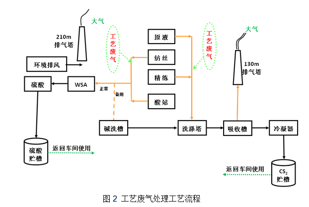 工藝廢氣采用1套處理能力為100,000m3/h的WSA處理工藝和4套處理能力分別為60,000m3/h的“堿洗+吸附+冷凝回收”廢氣處理裝置進行處理,其中“堿洗+吸附”的尾氣進入電廠循環流化床鍋爐進行燃燒以進一步減輕對環境的污染,WSA尾氣及車間環境排風由210m排氣塔排放。WSA 及“堿洗+吸附+冷凝回收”工藝流程如下: