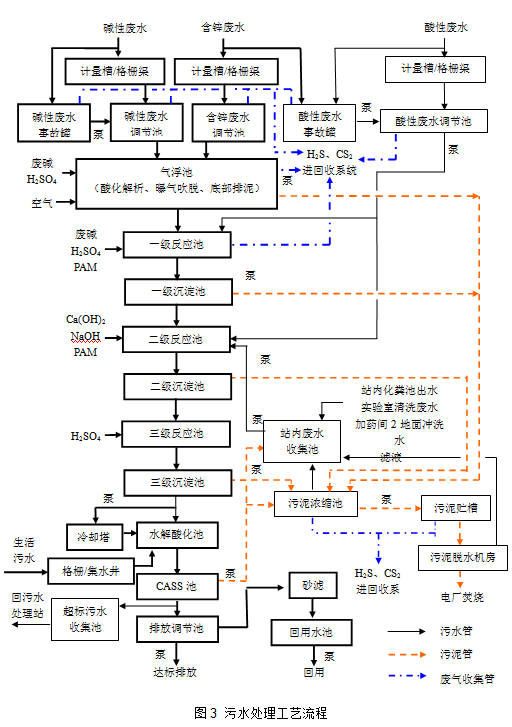 生產過程中產生的生產廢水及生活污水經收集處理后全部進入日處理能力6萬噸的污水處理廠進行處理,污水廠采用“并列的物化+生化”二級處理工藝,即并列的酸堿廢水混合中和、曝氣吹脫去除H2S、投加石灰乳沉淀去除鋅的一級物化處理工藝,加上CASS工藝的二級生化處理工藝,將處理達標的污水通過排海管道排向指定海域。為防止污水處理廠運行超負荷,建設有2個4000m3事故應急罐,以攔截生產過程中可能產生的異常來水。